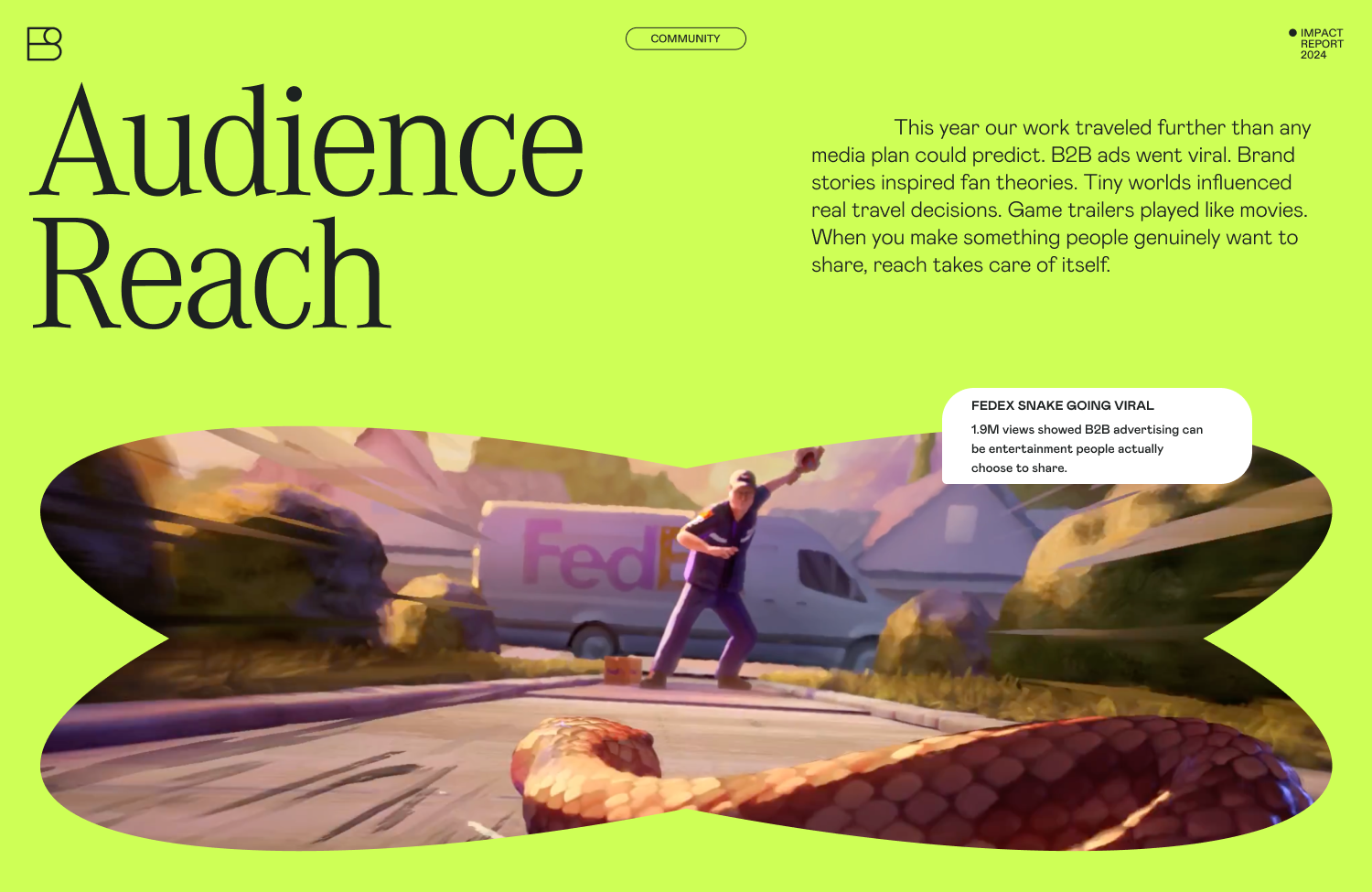 The annual Impact Report tracks BUCK’s progress and celebrates its growth and evolution as a company and creative community. 2024 was about growth and transformation. The design aesthetic for the BUCK 2024 Impact Report channels momentum, rhythm, and play. Less quiet reflection, more vibrant momentum. An expression of the company’s moment of expansion with purpose and energy.